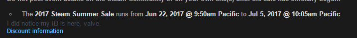 როგორც ჩვეულებრივ ხდება, ინფორმაციის გაჟონვა მოხდა ელექტრონული წერილების საშუალებით, რომლებსაც Valve წინასწარ უგზავნის მომხმარებლებს მოსალოდნელი ფასდაკლების შესახებ თარიღის მისაწოდებლად. თუ გავრცელებულ სკრინშოტს დავუჯერებთ, ახალი საზაფხულო ფასდაკლება დაიწყება 22 ივნისს და დასრულდება 5 ივლისს. მოცემული თარიღი სიმართლესთან ახლოსაა და დაახლოებით ემთხვევა გასული წლის თარიღს.