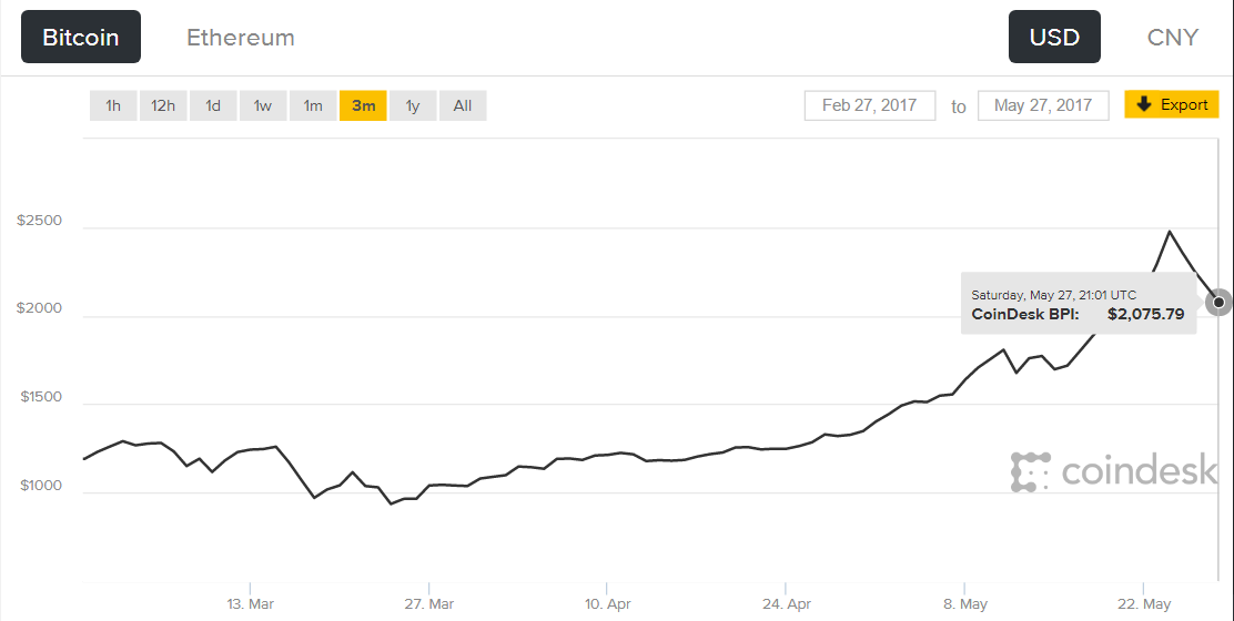 2017 წლის დასაწყისიდან კრიპტოვალუტის კურსი გაორმაგდა და 20 მაისისთვის მისი ფასი 2 ათას დოლარს გასცდა და აგრძელებდა ზრდას 2799 დოლარის ნიშნულამდე, რის შემდეგაც მოულოდნელი ვარდნა დაიწყო.