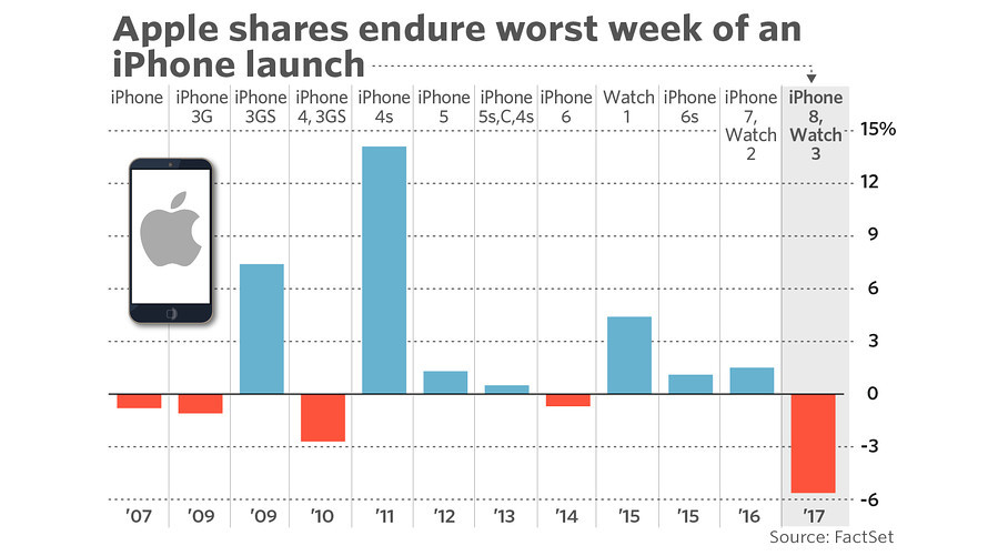 CNBC ამბობს, რომ Apple-ის კაპიტალიზაცია უფრო მეტია ვიდრე Target, eBay, Ford და დაცემის შემდეგ ის Alphabet-ის კაპიტალიზაციას თითქმის 100 მილიარდით აღემატება. კომპანიის აქციების ფასი 2017 წლის 22 სექტემბრის მონაცემებით 30%-ით აღემატება იგივე მაჩვენებელს ერთი წლის წინ, მაგრამ მიუხედავად ამისა ეს ყველაზე უარესი ახალი iPhone-ების გაშვების წინა კვირაა კომპანიის ისტორიაში.