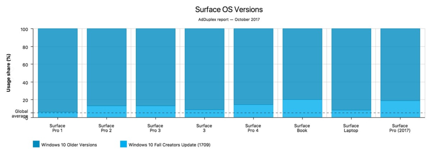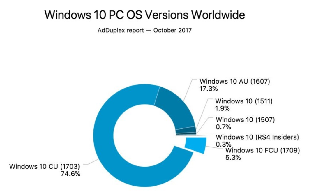 AdDuplex-ის კვლევის თანახმად მომხმარებლების მხოლოდ 5,3% განახლდა Windows 10-ის Fall Creators Update-ზე. განახლებამ არც ისე მცირე ცვლილებები მოიტანა, მათ შორისაა სამომხმარებლო ინტერფეისის Fluent Design ელემენტებით განახლება, ახალი შესაძლებლობები Edge ბრაუზერში, შერეული რეალობის მხარდაჭერა, სწრაფი წვდომა რჩეულ კონტაქტებზე და სხვა მრავალი. მიუხედავათ იმისა, რომ 5,3% არ გამოიყურება შთამბეჭდავად, სპეციალისტები AdDupex-ში გვარწმუნებენ, რომ Fall Creators Update წინა განახლებებზე გაცილებით სწრაფად ვრცელდება.