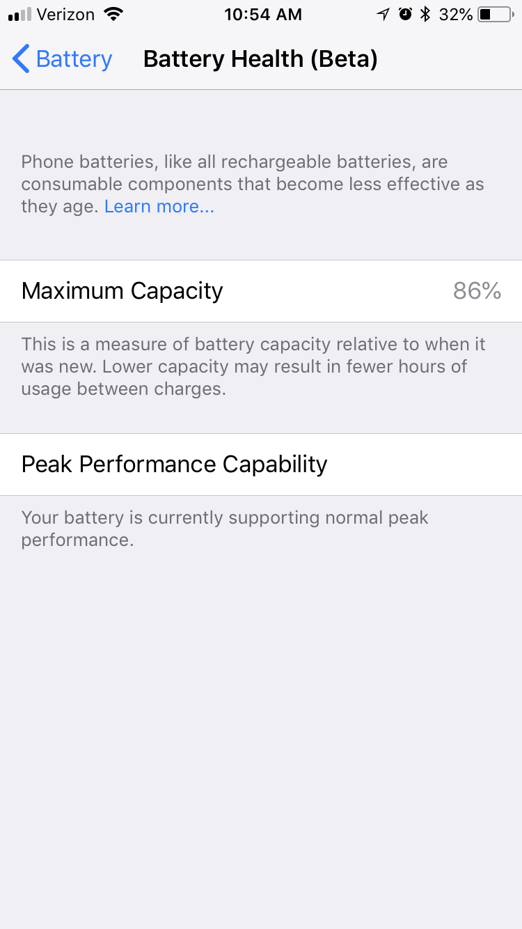პარამეტრებში არის "Peak Performace Capacity" ერანი. თუ თქვენს ტელეფონს არასდროს არ ქონია მოულოდნელად გამორთვის პრობლემა აკუმლატორის გამო მაშინ იქ წაიკითხავთ "Your battery is currently supporting normal peak perfomance"- მაგრამ საწინააღმდეგო შემთხვევაში თქვენ ნახავთ: