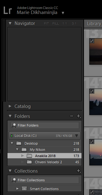 Lightroom გვეხმარება ფოტოების დახარისხებასა და ორგანიზებაში. როდესაც Lightroom-ში ვაიმპორტებთ ფოტოებს, ვხედავთ მათ მდებარეობას კომპიუტერში. ეს ჩნდება ეკრანის მარცხენა გვერდითა მხარეს, როგორც ფოტოზე ჩანს.