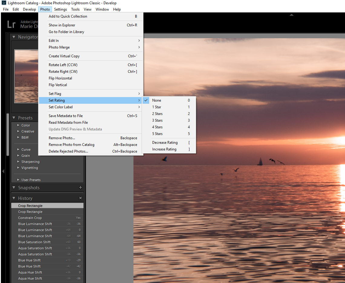 ამის გასაკეთებლად ყველაზე მარტივი გზაა კლავიატურაზე შესაბამის ციფრს დავაჭიროთ. იგივეს ვაკეთებთ მენიუდან შემდეგნაირად: Photo > Set Rating > Five Star.