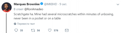 YouTube ბლოგერმა, მარკუს ბრაუნმა, რომელიც ცნობილია ფსევდონიმით MKBHD, თქვა, რომ მისმა სმარტფონმა მიკრო ნაკაწრების განყუთვის დროსაც კი მიიღო – მანამ, სანამ მოწყობილობას მაგიდაზე დადებდა ან ჯიბეში ჩაიდებდა.
