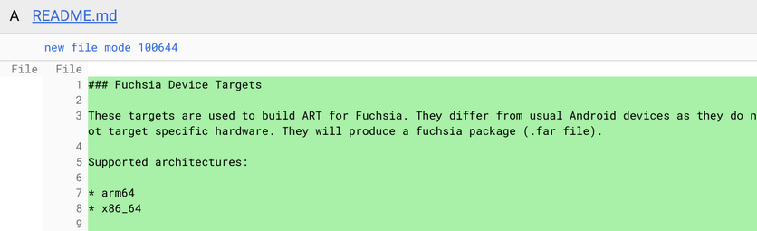 2018-წლის დეკემბერში კოდში აღმოაჩინეს ორი რეპოზიტორია Fuchsia OS-ისთვის, რომლებიც Android Open Source Project (AOSP) არის დაკავშირებული. დიდი ხნის განმავლობაში მათში არანაირი სასარგებლო ინფორმაცია არ იყო, მაგრამ ერთ-ერთში უკვე გამოჩნდა ფაილი readme. მასში ნათქვამია, რომ Android აპლიკაციების გაშვება იქნება შესაძლებელი Fuchsia საოპერაციო სისტემაში.