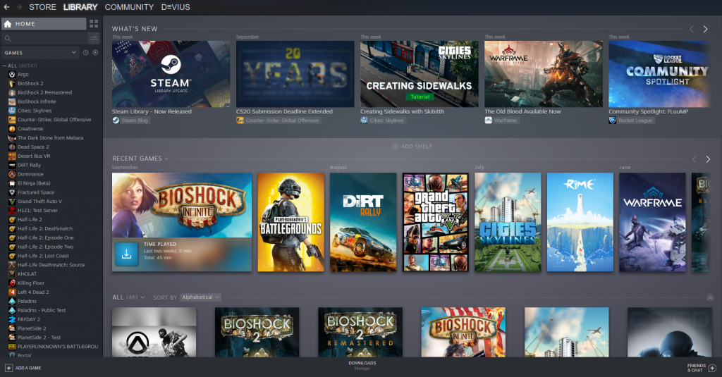 ბიბლიოთეკაში პირველი სტრიქონი სიახლეების ლენტაა, რის შემდეგაც ბოლო აქტივობების ჩამონათვალია ხოლო შემდეგ მოდის თქვენი თამაშების კოლექცია.