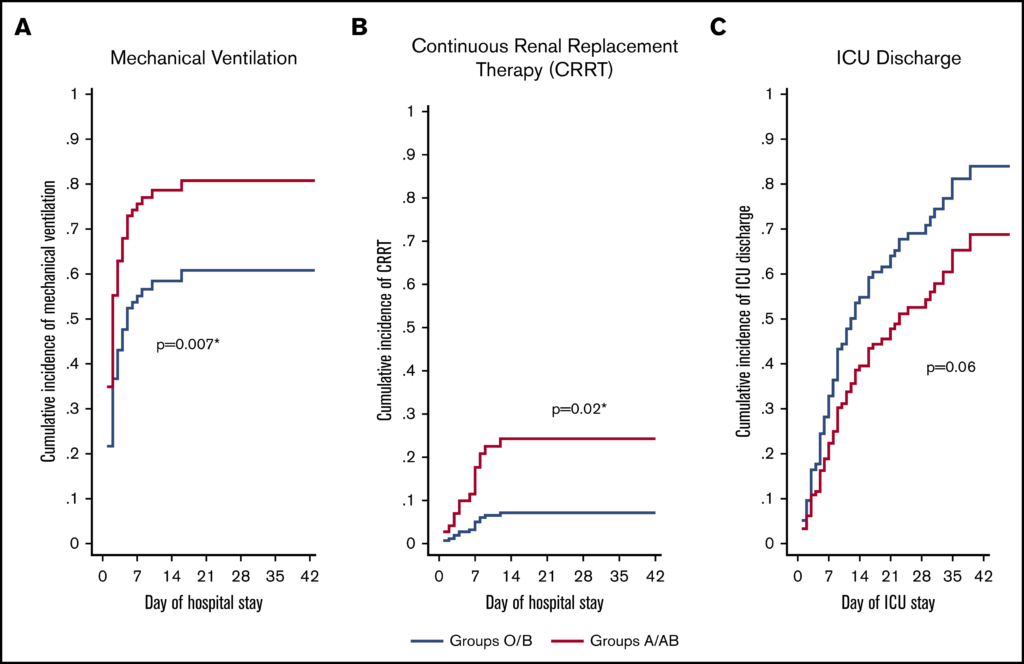 აღმოჩნდა, რომ II და IV ჯგუფის სისხლის მქონე პაციენტებს უფრო ხშირად დაჭირდათ ფილტვების ხელოვნური ვენტილაცია. ასევე ამ ჯგუფის პაციენტების დიდ ნაწილს დაჭირდა დიალიზის პროცედურებიც თირკმლების უკმარისობის სამკურნალოდ.