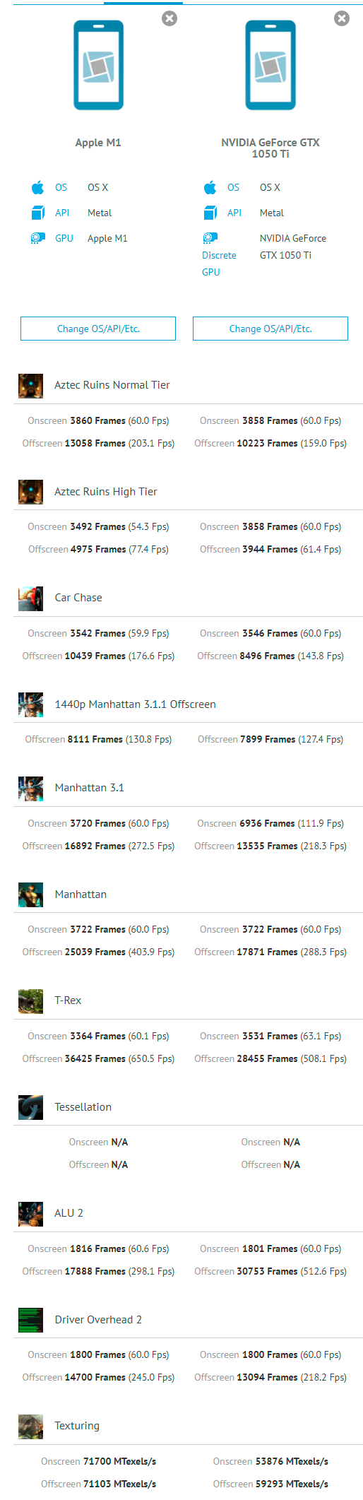 ორივე სისტემა macOS-ზე დაიტესტა და გამოყენებულ იქნა Metal გრაფიკული ინტერფეისი. რადგანაც Apple-ს მანამდე მხოლოდ AMD ქონდა დისკრეტული გრაფიკისთვის შედარებაში გამოყენებულ იქნა GeForce GTX 1050 Ti, რომელიც გარე კორპუსში იყო მოთავსებული და სისტემას Thunderbolt 3 ინტერფეისით უკავშირდებოდა.