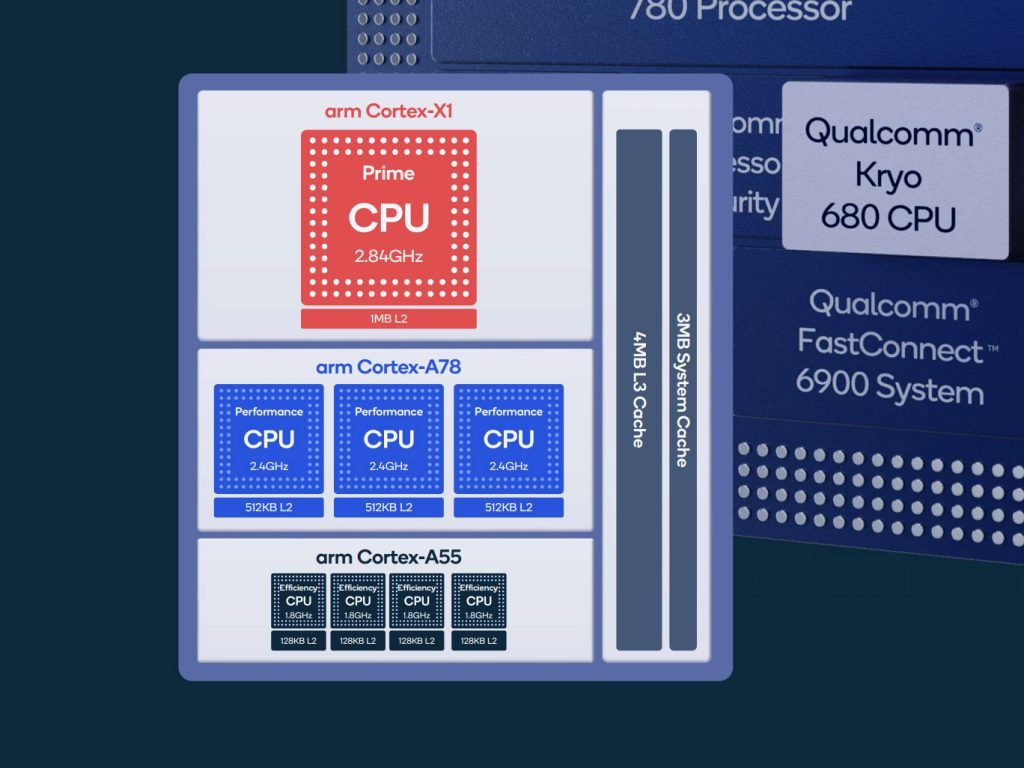 როგორც ყოველთვის, პროცესორს 8 ბირთვი აქვს და მათავარი ბირთვი განკუთვნილია მაღალწარმადი ამოცანებისთვის, სამი ბირთვი ფონური მძიმე აპლიკაციებისთვის და კიდევ ოთხი ბვირთვი დაბალი პროერიტეტის მქონე სერვისებისთვის. მთავარი ბირთვი დაფუძნებულია ARM Cortex-X1 არქიტექტურაზე და მუშაობს 2,84 გჰც-ზე. სამი დამატებითი ბირთვი Cortex A78, ხოლო დანარჩენი ოთხი Cortex A55.