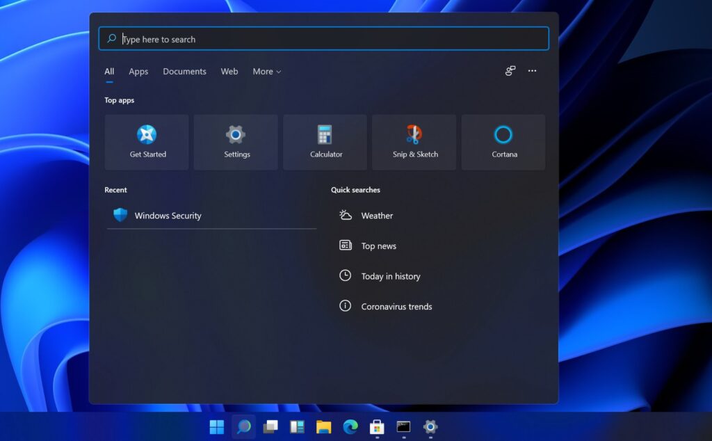 Windows 11-ში აპლიკაციების გამშვები ხატულები ამოცანათა პანელის ცენტრშია განთავსებული. ახალი “სტარტ” ღილაკი ხსნის მენიუს, რომელი უკვე არსებული მენიუს გამარტივებული ვარიანტია. ასევე არის სწრაფად გამორთვისა და გადატვირთვის შესაძლებლობაც.