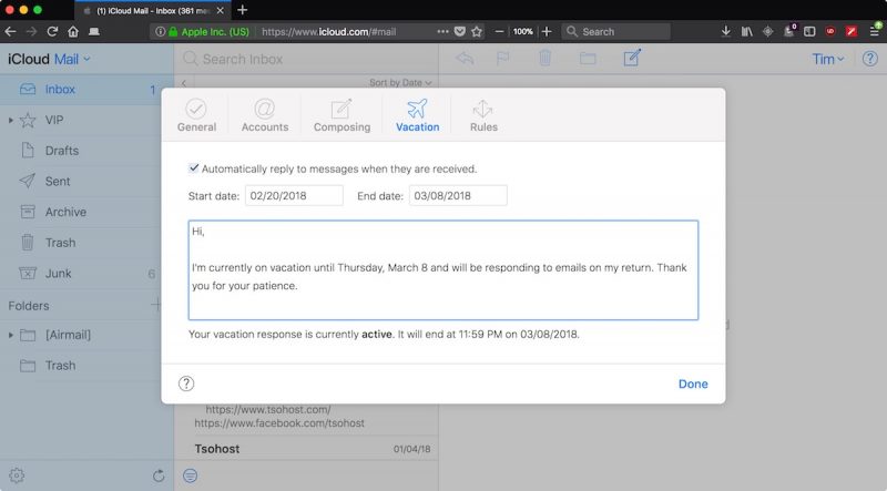iCloud ფოსტის სერვისი გთავაზობთ მარტივ და მოსახერხებელ მექანიზმს, რათა ავტომატურად უპასუხოთ ფოსტას მითითებულ დროში. თუ ამ პერიოდის განმავლობაში ვერ უპასუხებთ წერილებს, შეგიძლიათ წინასწარ დააკონფიგურიროთ სასარგებლო და აუცილებელი ფუნქცია.
