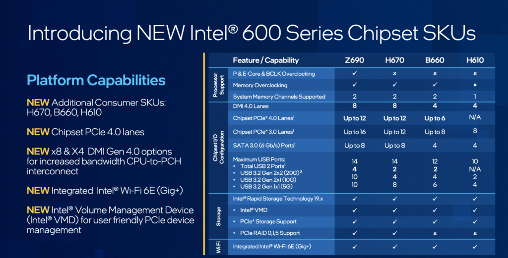 გარდა ამისა Intel-მა წარმოადგინა H670, B660 და H610 ჩიპსეტები, რომლებსაც Z690-ისგან განსხვავებით ნაკლები PCIe და USB პორტები აქვს, მაგრამ შენარჩუნებულია მთავარი სიახლეები, მათ შორის Wi-Fi 6E და PCIe 4.0.