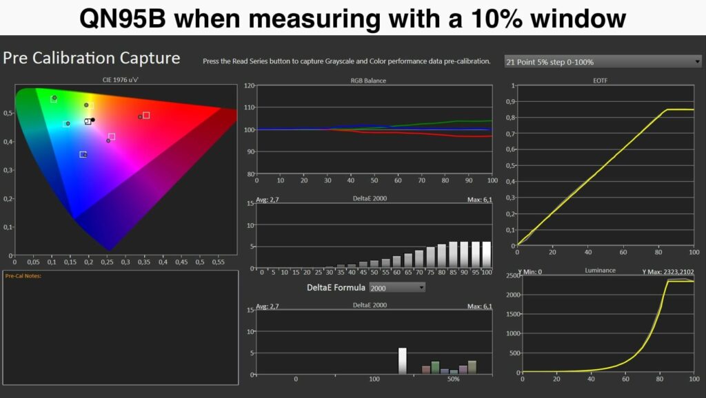 ზემოთ მოცემულ სურათებზე ორი გრაფიკია: EOTF და Luminance. ყვითელი ხაზი არის საორიენტაციო ნიშანი, ხოლო ნაცრისფერი ხაზი არის ზომები. ეკრანის 10%-ზე HDR ტესტირებისას, ინდიკატორები თითქმის არ სცდებიან ყვითელ ხაზს. მაგრამ როდესაც იგივე ტესტს აწარმოებთ ეკრანის 9%-ზე, სიკაშკაშე 80%-ით ეცემა და გაზომვები აღარ შეესაბამება სტანდარტს.