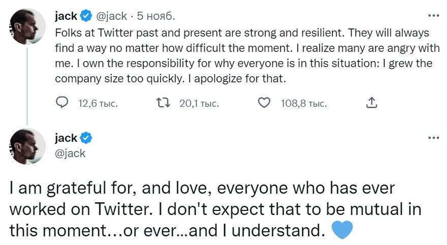 „თვითერზე წარსულში და აწმყოში ადამიანები ძლიერები და გამძლეები არიან. რაც არ უნდა რთული სიტუაცია იყოს, ისინი ყოველთვის იპოვიან გამოსავალს. მესმის, რომ ბევრი ადამიანი ჩემზე გაბრაზებულია. მე ვარ პასუხისმგებელი იმაზე, თუ რატომ აღმოჩნდა ყველა ამ მდგომარეობაში: ძალიან სწრაფად გავაფართოვე კომპანია. ბოდიშს ვიხდი ამის გამო“, – წერს ჯეკ დორსი.