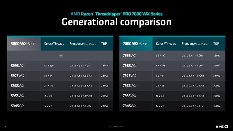 სერიის ფლაგმანია 96 ბირთვიანი Ryzen Threadripper PRO 7995WX 192 ძაფამდე დამუშავების უნარით და ოპერაციული სიხშირით 2.5-დან 5.1 გჰც-მდე. AMD ირწმუნება, რომ ეს პროცესორი უზრუნველყოფს 223%-ით მეტ შესრულებას, ვიდრე მისი უმაღლესი დონის Intel პროცესორი V-Ray-ში, ასევე 2.2-ჯერ აღემატება Intel-ის კოლეგებთან შედარებით სიმძლავრის ეფექტურობას.