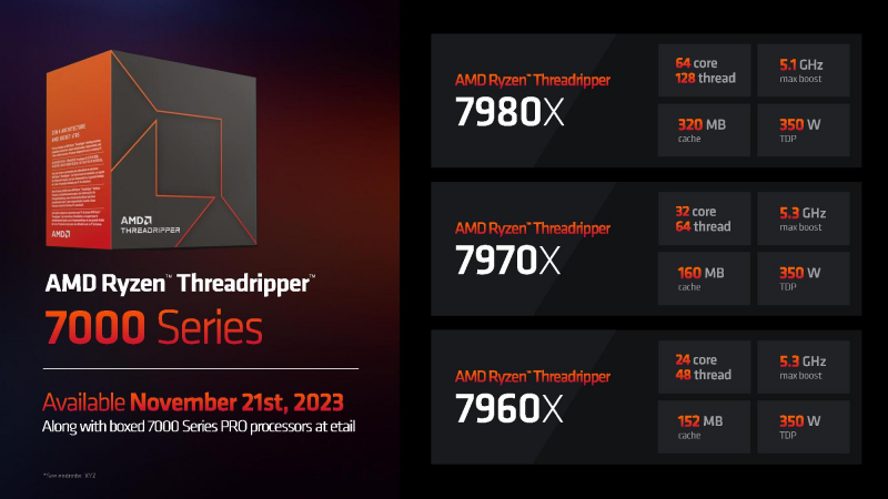 Ryzen Threadripper 7000 პროცესორები ხელმისაწვდომი იქნება 21 ნოემბერს, ხელმისაწვდომი იქნება როგორც OEM კონსტრუქციებში, ასევე სამუშაო სადგურებში და როგორც დამოუკიდებელ ერთეულებში.