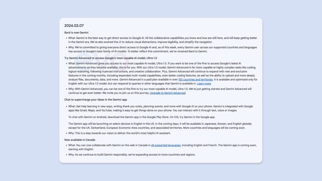 პარალელურად ხელმისაწვდომი გახდება ფასიანი Gemini Advanced დონე, ასევე გამოვა Gemini აპლიკაცია Android-ისთვის. Gemini Advanced მომხმარებლებს მისცემს წვდომას Gemini Ultra 1.0 მოდელზე, რომელსაც შეუძლია “ძალიან რთული ამოცანების შესრულება, მათ შორის პროგრამირება, ლოგიკური მსჯელობა, დეტალური ინსტრუქციების დაცვა და შემოქმედებითი თანამშრომლობა.” სიახლე ხელმისაწვდომი იქნება 150-ზე მეტ ქვეყანაში და ოპტიმიზირებულია ინგლისურ ენაზე.