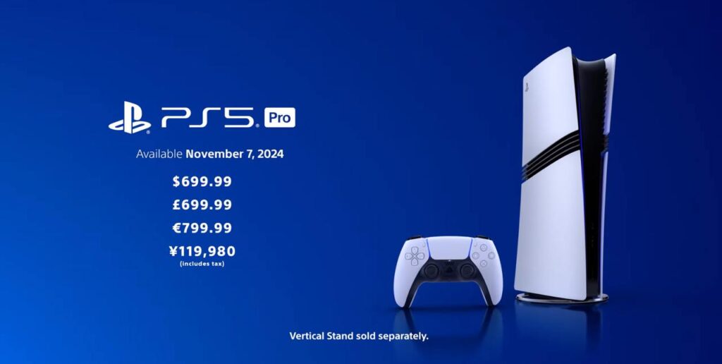 2024 წლის 10 სექტემბერს Sony-მ ტექნიკური პრეზენტაციის ფარგლებში გაამჟღავნა ინფორმაცია $700 ღირებულების PlayStation 5 Pro სათამაშო კონსოლის შესახებ. მოწყობილობის ბაზისურ კომპლექტაციაში არ იქნება დისკის წამკითხველი, მისი შეძენა მოგიწევთ ცალკე, ისევე როგორც ვერტიკალური განთავსების სადგამის. PS5 Pro-ს გაყიდვები დაიწყება 7 ნოემბერს, წინასწარი შეკვეთები კი – 26 სექტემბრიდან.