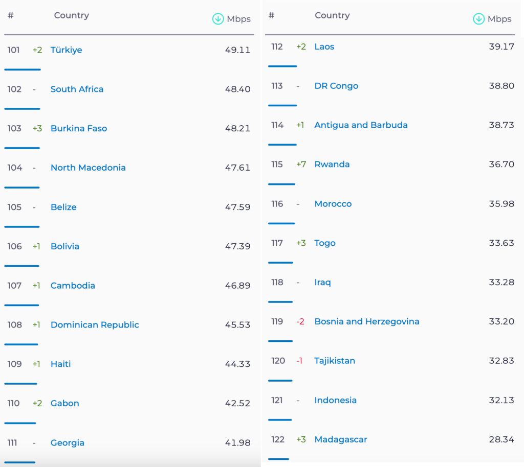 ამ რეიტინგის მიხედვით საქართველო 111 ადგილზეა საშუალოდ 41.98 მეგაბიტი წამში სიჩქარით და უსრწებს ისეთ ქვეუნებს, როგორიცაა ლაოსი, კონგო, რუანდა, ტაჯიკეთი და მადაგასკარი. აღსანიშნავია ისიც, რომ ჩვენზე უკეთესი ინტერნეტი აქვს გაბონს, ჰაიტის, კამბოჯას, ბელიზს, ბოლივიას და მეზობელი თურქეთი 10 პოზიციით გვასწრებს კიდევაც.