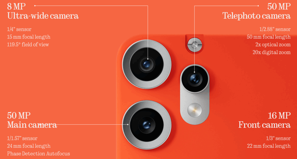 კამერები: 50 MP (ძირითადი), 8 MP (ულტრაგანიერი), 50 MP (ტელეფოტო); 16 MP (ფრონტალური)