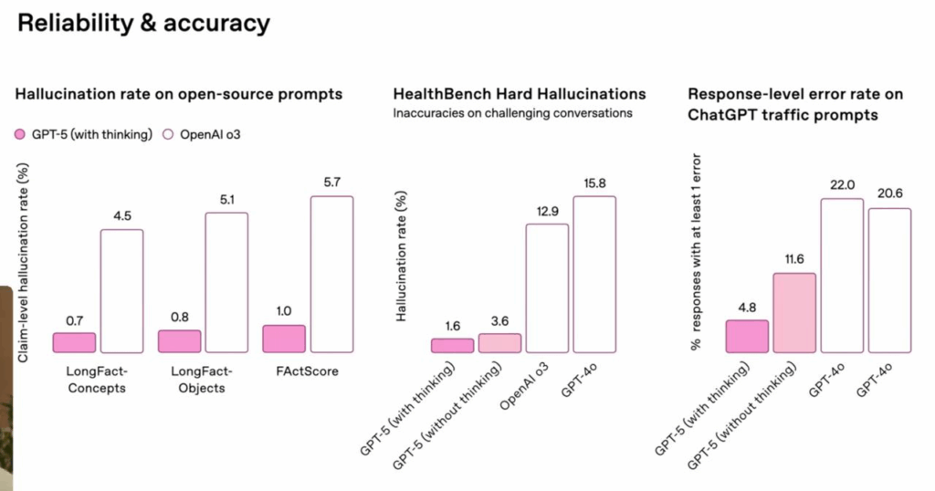 ჰალუცინაციების რაოდენობის შემცირება GPT-5-ის ერთ-ერთი მთავარი დაპირებაა. OpenAI-ის თქმით, ვებ-ძიების ჩართვისას, მოდელში ფაქტობრივი შეცდომების ალბათობა დაახლოებით 45%-ით დაბალია, ვიდრე GPT-4o-ში. „thinking“ რეჟიმში შეცდომების რაოდენობა 80%-ით მცირდება o3-თან შედარებით. ღია, ფაქტებზე დაფუძნებულ ტესტებში, როგორიცაა LongFact და FActScore, GPT-5 დაახლოებით 6-ჯერ ნაკლებ ჰალუცინაციას იძლევა, ვიდრე o3.