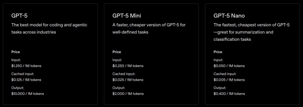 API გთავაზობთ მოდელების სამ ზომას: gpt-5, gpt-5-mini და gpt-5-nano. OpenAI აცხადებს, რომ gpt-5 არის „აზროვნების“ ყველაზე მძლავრი ვარიანტი, რომლის ღირებულება იწყება 1,25 დოლარიდან მილიონ შეყვანის ტოკენზე და 10 დოლარიდან მილიონ გამომავალ ტოკენზე.